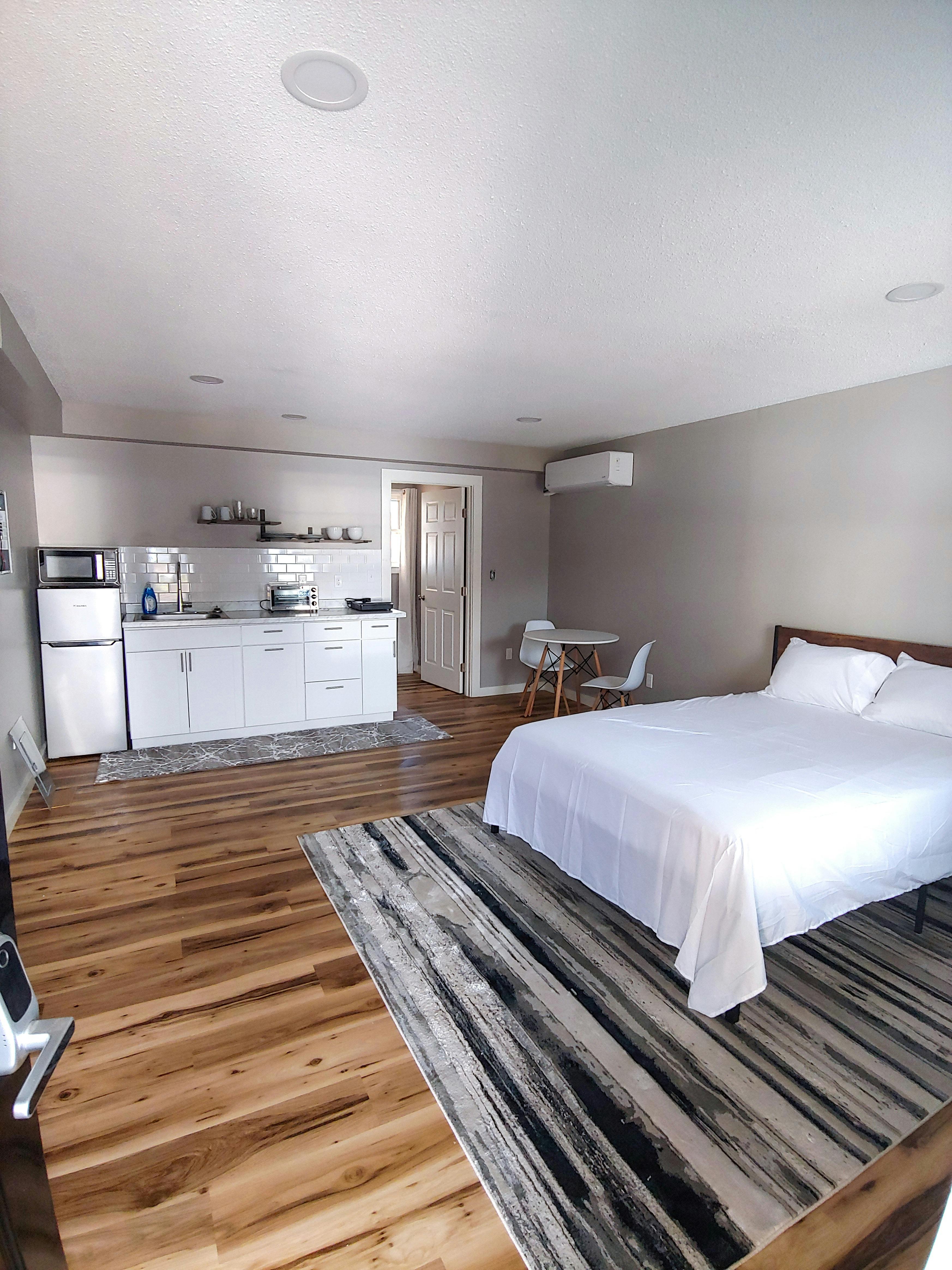 Rooms are equipped with flat screen TV, a queen bed, tub/shower, small dining corner, and a kitchenette with stove top, microwave, coffee maker, toaster and a refrigerator. Rooms are decorated with light colors and wood furnishings.