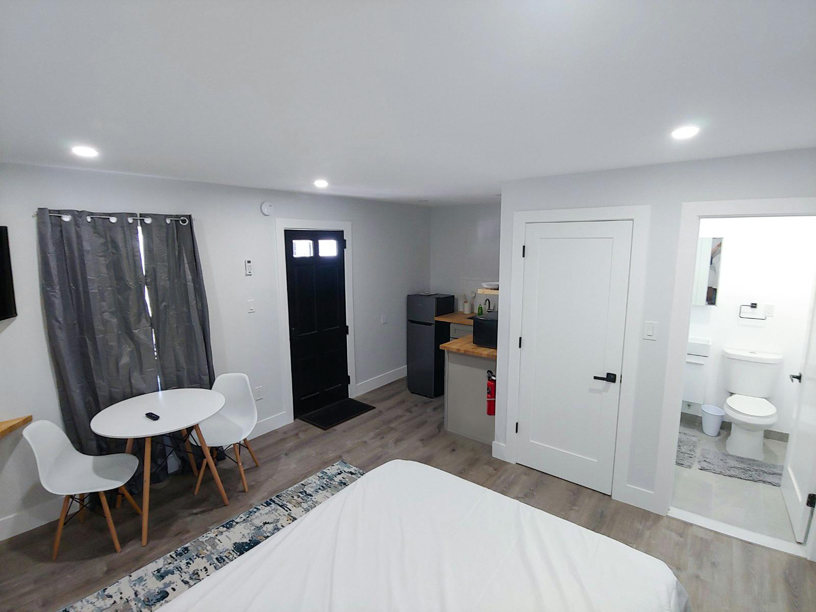 Rooms are equipped with flat screen TV, a queen bed, shower, small dining corner, and a kitchenette with stove top, microwave, coffee maker, toaster and a refrigerator. Rooms are decorated with light colors and wood furnishings.